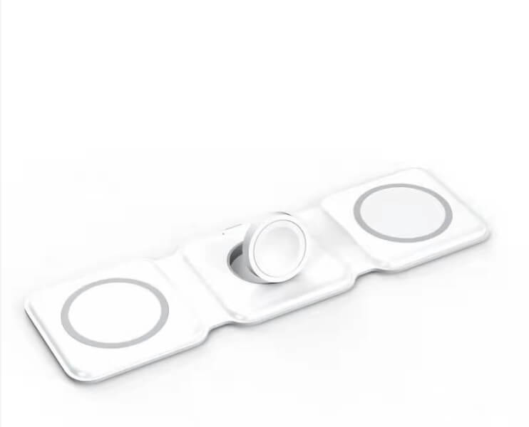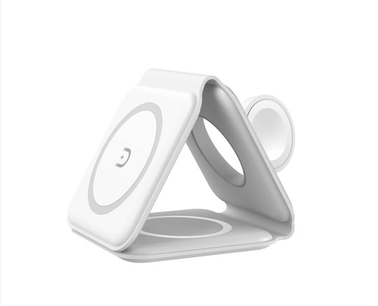 Charge your iPhone, Apple Watch, and AirPods all at once with the compact 3-in-1 foldable wireless charger. It features a MagSafe pad for compatible devices and a Qi-certified pad for others, plus a magnetic charging pad for your Apple Watch. Its travel-friendly design easily fits in your bag or pocket, and it folds into a stand for hands-free viewing. With built-in safety protocols and a 1m USB-C charging cable included, you can charge efficiently and safely.